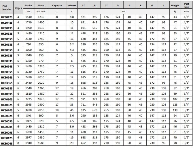 | PART NUMBER | STAGES | STROKE | PIVOT CENTRE | CAPACITY | VOLUME | DIMENSIONS (mm) | WEIGHT | PORT SIZE | |||||||